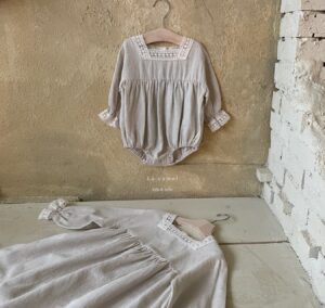 レース使いや刺繍やフリルを使ったワンピースやロンパースもたくさんお取り扱いがあるのですが、ベーシュ系の色味なので、可愛くなりすぎないところが好きなポイントです。