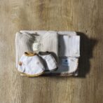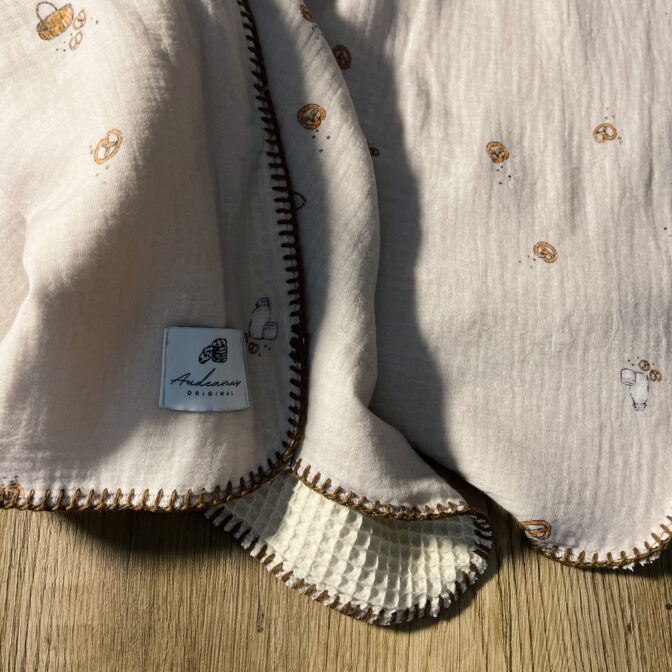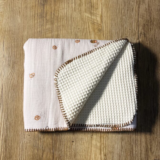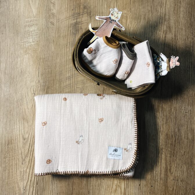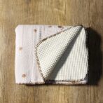 表地はモスリン生地、裏地はワッフル生地、いずれも赤ちゃんに優しいオーガニック素材で、洗えば洗うほど柔らかい風合いとなるのが特徴です。