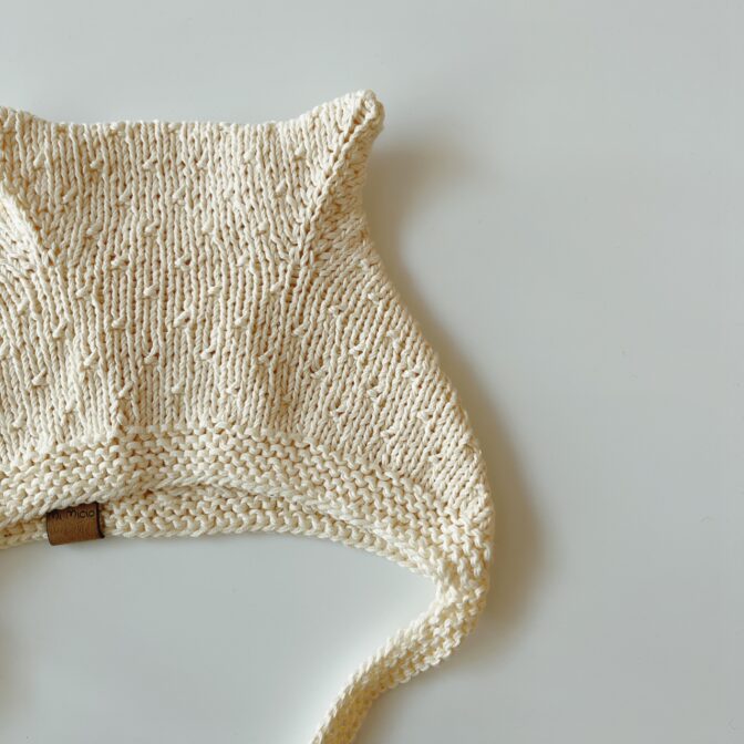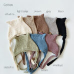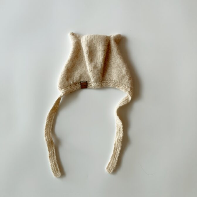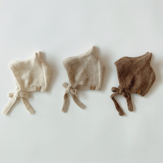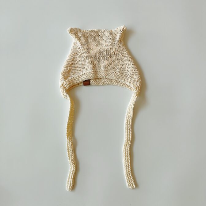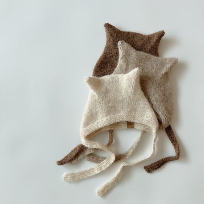 Dots柄の編み目が特徴的で、ねこ、羊、うさぎ、くま等をモチーフにした帽子を始め、Popcorn柄のセーターやミニマフラーのお作りもあります。