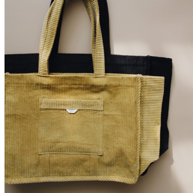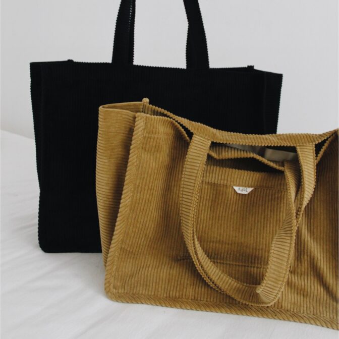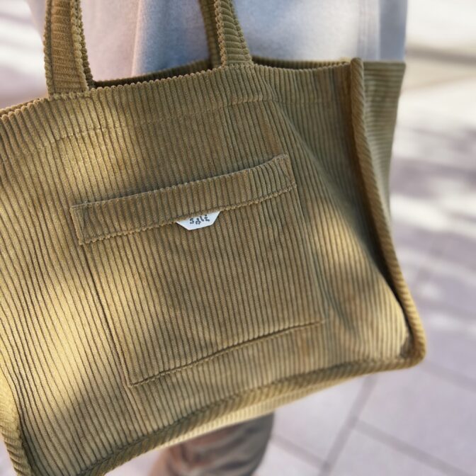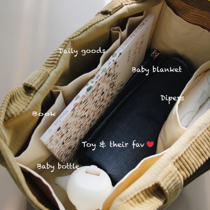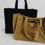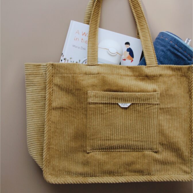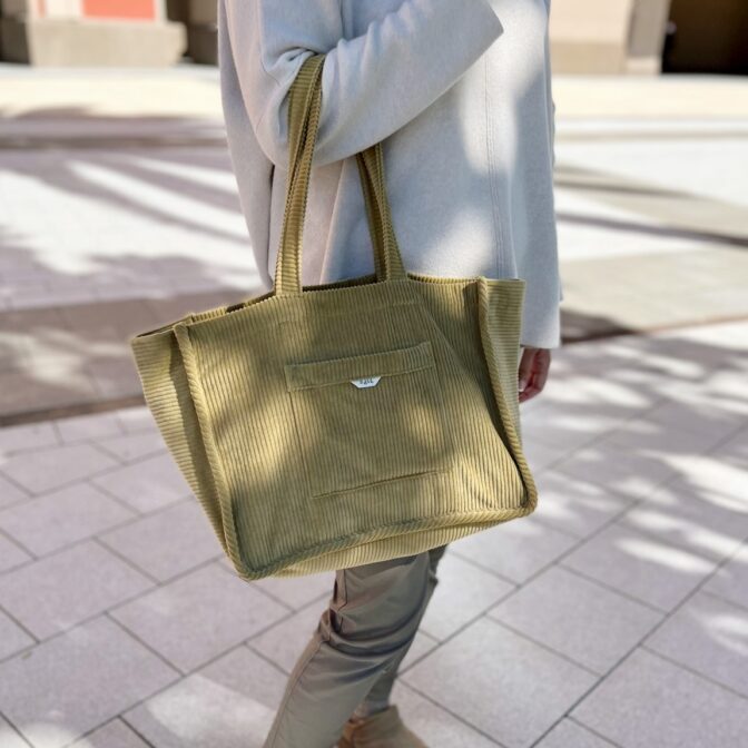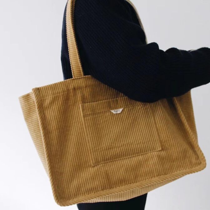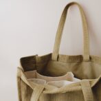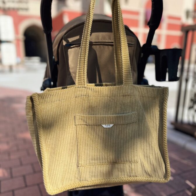 伝統的なコーデュロイ生地にキャンパス生地のバッグインバッグが付いたこのトートは仕切りポケットが8つもあり、子育て中の荷物の多いママにぴったりのバッグ。