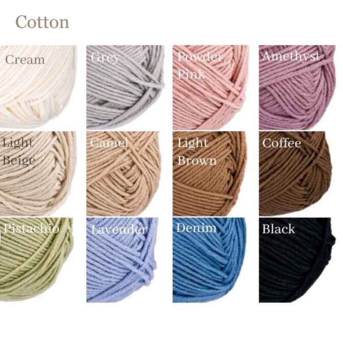 Cream / Grey / Powder pink / Amethyst / Light beige / Camel / Light brown / Coffee / Pistachio / Lavender / Denim / Black