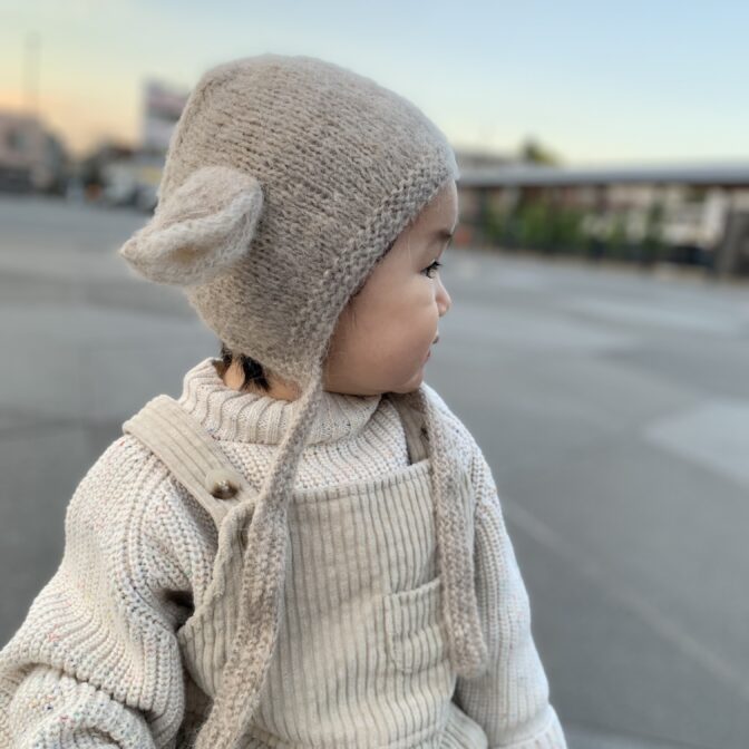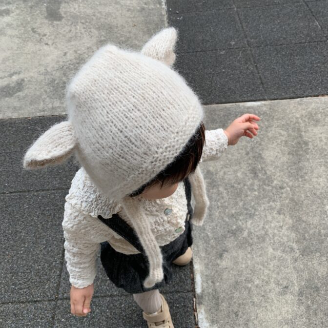 Dots柄の編み目が特徴的で、ねこ、羊、うさぎ、くま等をモチーフにした帽子を始め、Popcorn柄のセーターやミニマフラーのお作りもあります。