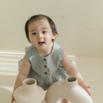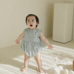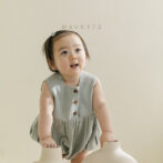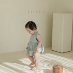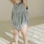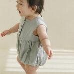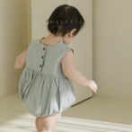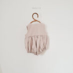 お尻周りのボリュームが可愛いノースリーブのロンパースです。